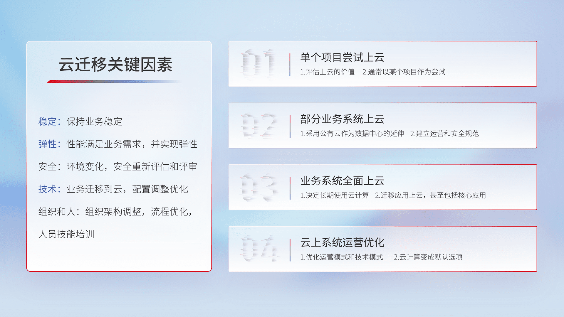 结合实际业务,,,,从规划设计、、、云平台选型、、云原生改造、、、数据迁移、、集成交付,,,迁移全过程为客户识别最佳上云路径,,做好风险识别管理,,设计网络架构、、、、身份权限、、、、安全审计合规、、操作审计、、、、日志审计、、监控告警策略、、、多站点容灾设计等,,,,对云上基础设施进行整体规划,,,提升IT治理水平,,,以满足弹性、、高可用、、、高性能的需求。。。。