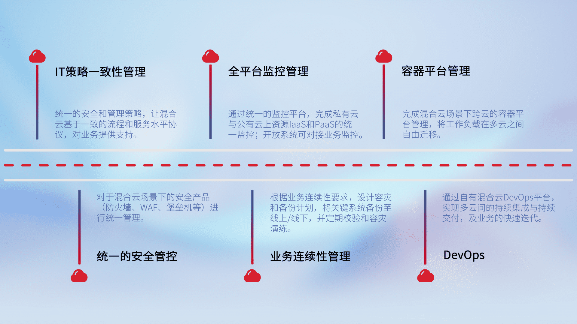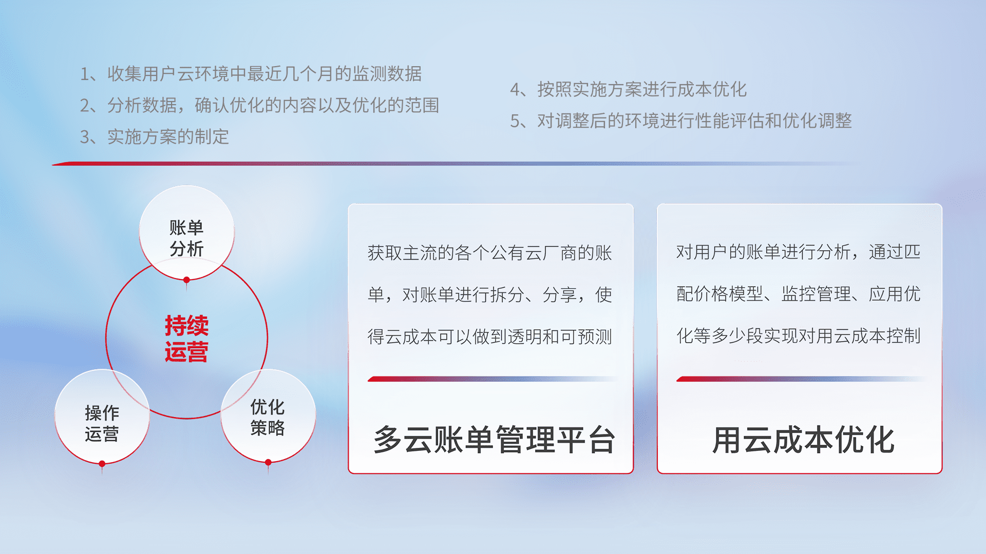 通过多云纳管,,,,以统一的资源数据模型把客户的云资源进行抽象和封装,,进而实现对多云资源的统一操作,,保障云资源管理的可靠性、、稳定性与可用性。。量身定制化运维内容,,配置、、开发运维、、、补丁管理、、、备份、、、监控、、认证和访问管理、、、审计和日常巡检等,,,,保障在用云过程中的可靠度,,,稳定度以及高可用率。。。。
