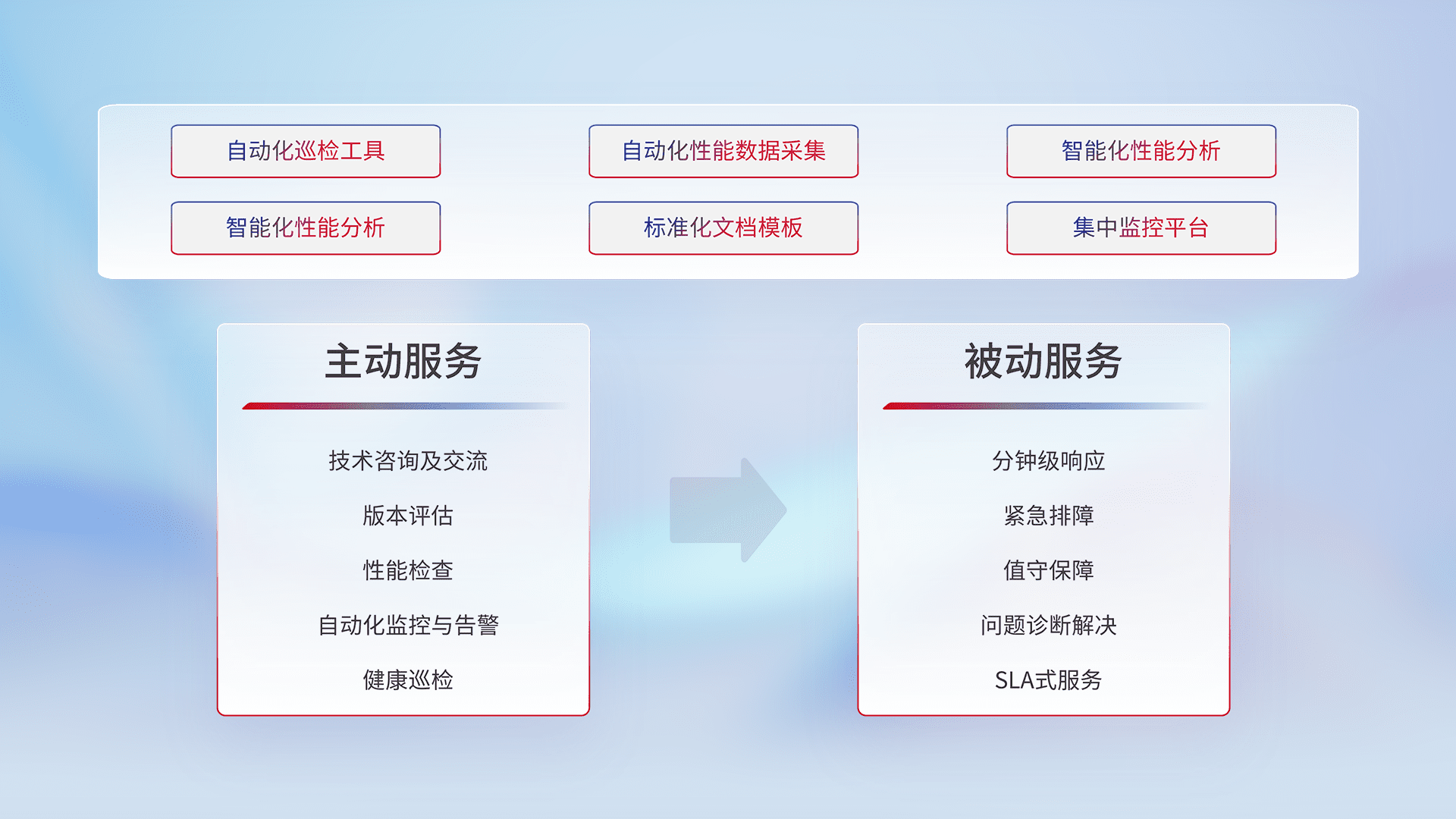 智能化工具和标准化文档,,,保障服务质量,,提供主动服务(包含技术咨询、、、版本评估、、、、性能检查、、、、自动化监控与告警、、、、健康巡检)和被动服务包含(分钟级响应、、、、紧急排障、、、、值守保障、、、、问题诊断解决、、、SLA服务)。。